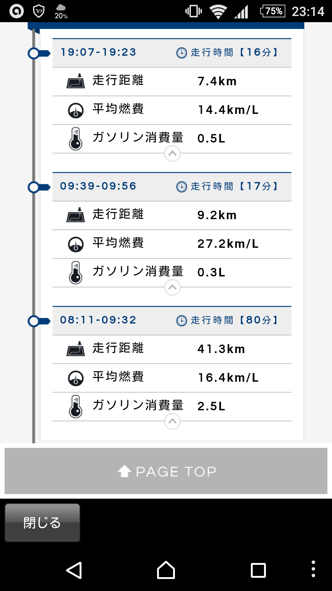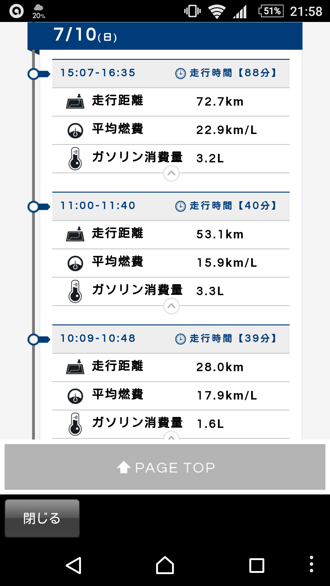 こんなに走った 釣り以外の何か 2016年07月16日 これは、車からの燃費報告の画面コピーです。帰り道では、東名と一般道で合計72.7km走って、燃費は22.9km/Lでしたわ。これはgoodです。この日は他にも15.9km/Lと17.9km/Lで、1日の平均は19.0km/Lでした。結構よく走りましたわ。