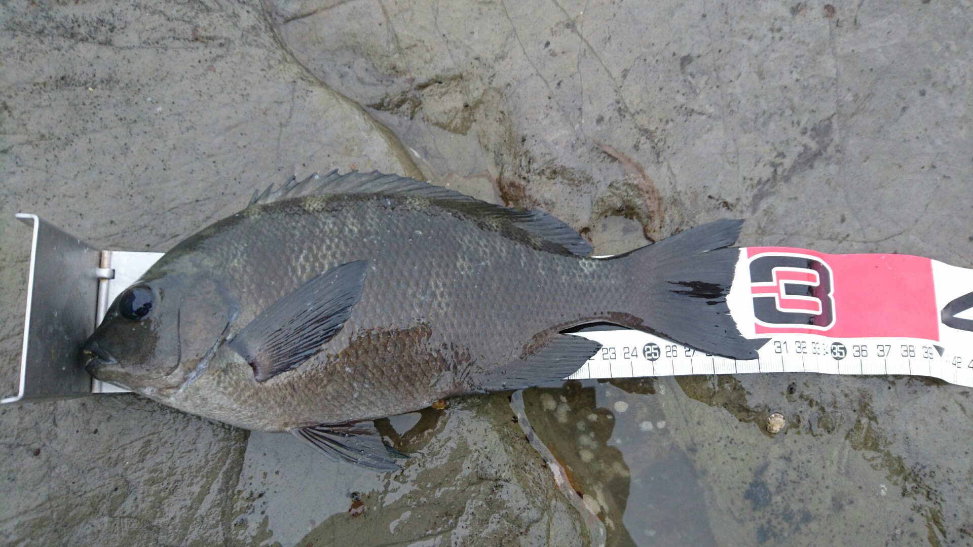 その後またしばらくして30cmを上げた後、第2のいつもの場所に移動。ここはあまり波が入っていないのでちょっと望みが薄そうですが、移動も疲れたのでそのまま続けていた5時頃、針に餌がちょこっとしか残ってないのを知りながら、面倒臭いのでそのままで流していたらなんと綺麗な当たり。またまたトルクのある引きで浮かすのがちょっと大変だったんですがなんとか無事ゲットは39cmでした。