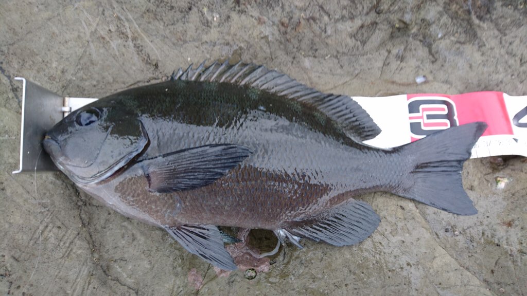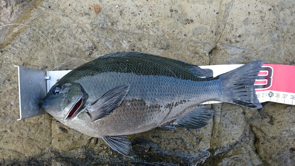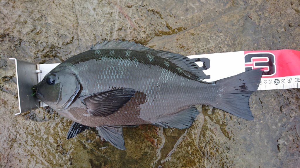 9/15 三浦半島・高磯 釣り 2018年09月15日 久々に釣れましたわ。いつも同行するかっぱさんは体調が良くないとのことで、久々に単独釣行になりました。で、高磯に行ったんですけど、予想外に波が酷くて先端部には近づけない状態。でも高い磯が空いていたんでそこでやりました。オキアミではフグの猛攻でどうにもならない感じだったんですが、そのうち木っ端の活性が上がってくるとフグを蹴散らしはじめ、木っ端が釣れるようになったものの、手のひらを超えるサイズは出ませんでした。で、海苔でやってみたところ、33cmが出ました。波けがあるんで海苔でもいけるかとは思いましたけど、いやー久々です。でも後がなかなか続かないまま、夕まずめに波が砕けるサラシの中を流していると、なんと37cmが出ました。その後は波の静かなところでアイゴの35cmが出たところで打ち止め。久々の複数釣果で楽しめました。た