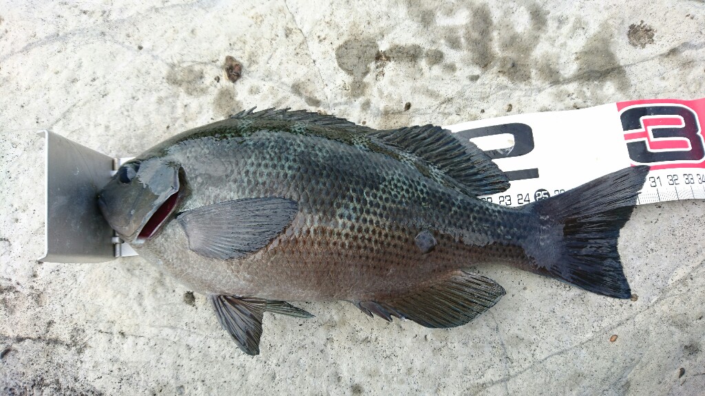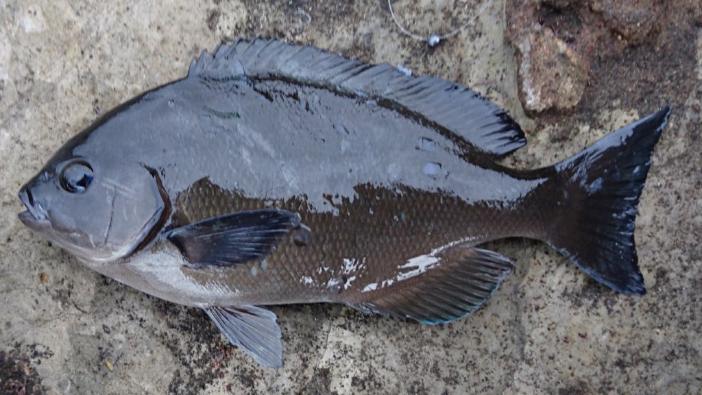 海苔でオナガが 釣り 2018年05月10日 いつも行く東風崎で何連敗していることか(-_-;)で、今回は高磯に行ってみました。風は強いですが、北風なんで波はなくベタベタの凪で期待薄でしたが、お友達のアイゴは来てくれました。久々に魚が釣れたんで嬉しかったですわ(^^;;夕方になって少し波気が出てきてこいつが来たんですが、ウキがすっ飛ぶような当たりでした。さすがオナガですわ。あ、サイズですか? 40・・・あったら良かったんですが、23センチ位でしょうか(^^;;しかし海苔でのオナガですからねえ初物です。ちなみに海苔では6目めになります。クチブト、アイゴ、クロダイ、フグ、ベラ、でオナガです。