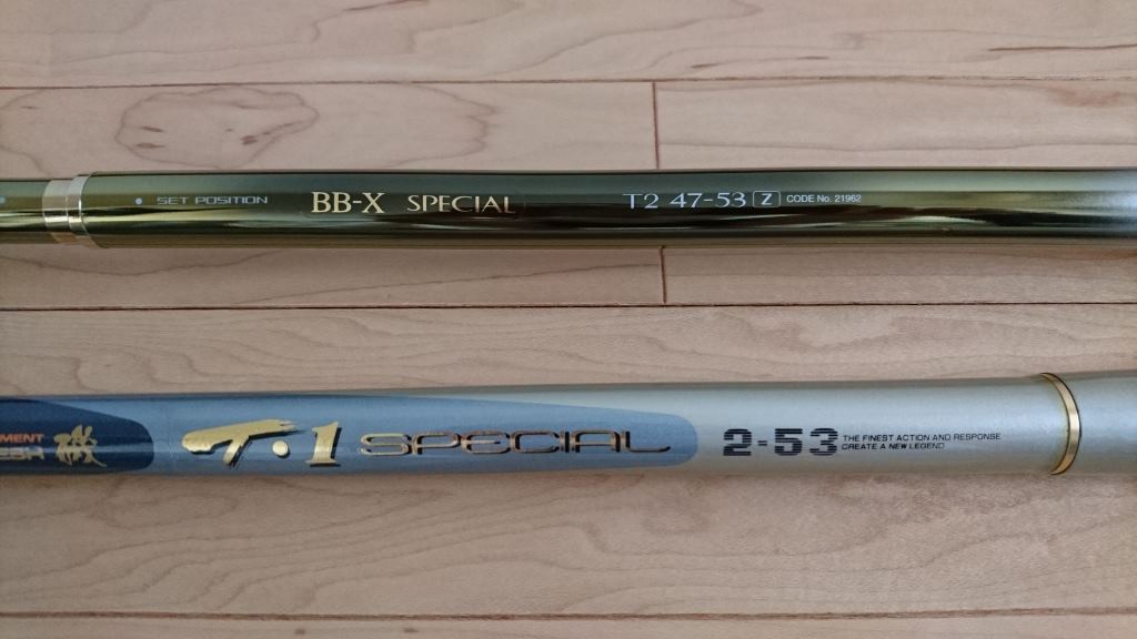 これで離島遠征もばっちり・・・なんだけど(-_-;) 釣り 2017年06月01日 SHIMANO BB-X Special T2 47-53 Z DAIWA TOURNAMENT Power Mesh 磯 T1 Special 2-53をゲットしました。これでいつでも離島遠征で60cm尾長が狙えます。って離島遠征なんて行けませんけど・・・(-_-;) BB-Xは15~20年近く前のモデル、トーナメントに至ってはおそらく30年位前の竿ですが、まったくの未使用品でピカピカです。たまたま知人が持っていたものですが、もう使わないからと譲っていただきました。が、私にももったいなくて使えません。売るわけにもいかず、どうしよう(^_^;)